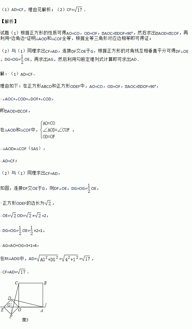 (2)他将正方形ODEF绕O点逆时针旋转,使点E旋转至直线l上,如图3,请你求出CF的长.