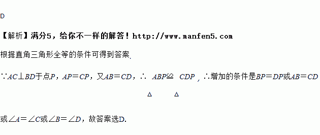 如图,AC⊥BD于点P,AP=CP,增加下列一个条件:①BP=DP;②AB=CD;③∠A=∠C.其中能判定△ABP≌△CDP的条件有 ( )