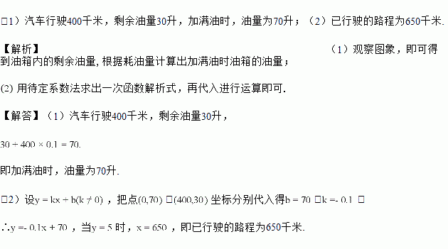 (1)根据图象,直接写出汽车行驶400千米时,油箱内的剩余油量,并计算加满油时油箱的油量;