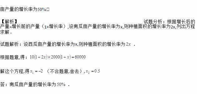 某农场种植了10亩地的西瓜,亩产量为,根据市场需要,今年该农场扩大了种植面积,并且全部种植了高产的新品种西瓜,已知西瓜的种植面积的增长率是亩产量的增长率的2倍,今年西瓜的总产量为![]()