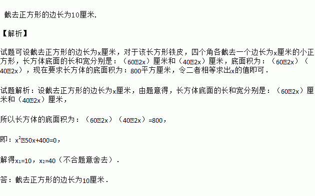 如图,一块长和宽分别为60厘米和40厘米的长方形铁皮,要在它的四角截去四个相等的小正方形,折成一个无盖的长方体水槽,使它的底面积为800平方厘米.求截去正方形的边长.