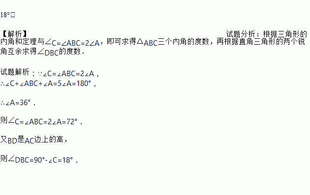 如图,在△ABC中,∠C=∠ABC=2∠A,BD是AC边上的高,求∠DBC的度数.