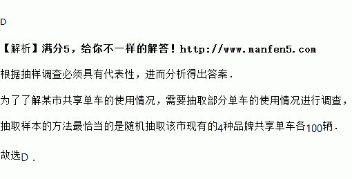 D. 随机抽取该市现有的4种品牌共享单车各100辆