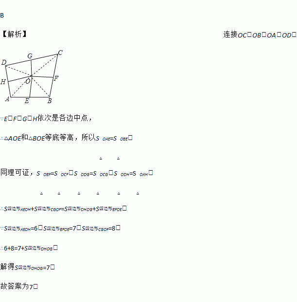 如图,四边形ABCD中,E、F、G、H依次是各边中点,O是形内一点,若四边形AEOH、四边形BFOE、四边形CGOF的面积分别为6、7、8,四边形DHOG面积为( )