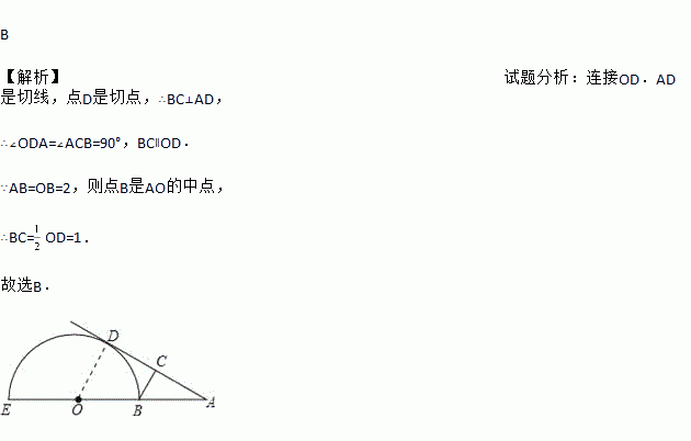 图中,EB为半圆O的直径,点A在EB的延长线上,AD切半圆O于点D,BC⊥AD于点C,AB=2,半圆O的半径为2,则BC的长为( )