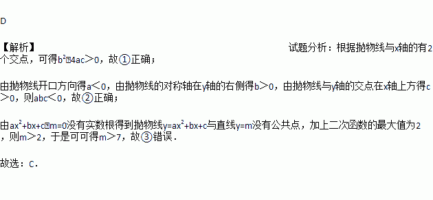 已知二次函数y=ax2+bx+c(a≠0)的图象如下图所示,且关于x的一元二次方程ax2+bx+c-m=0没有实数根,有下列结论:①b2-4ac>0;②abc<0;③m>2.其中,正确结论的个数是