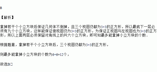 如图,是由27个相同的小立方块搭成的几何体,它的三个视图是3×3的正方形,若拿掉若干个小立方块(几何体不倒掉),其三个视图仍都为3×3的正方形,则最多能拿掉小立方块的个数为( )