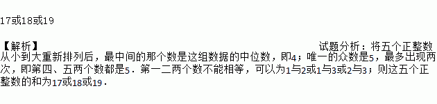 五个正整数从小到大排列,若这组数据的中位数是4,唯一众数是5,则这五个正整数的和为_____.