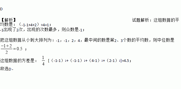 D 【解析】试题解析:这组数据的平均数是:(-1-1+4+2)÷4=1; -1出现了2次,出现的次数最多,则众数是-1; 把这组数据从小到大排列为:-1,-1,2,4,最中间的数是第2、3个数的平均数,则中位数是; 这组数据的方差是: [(-1-1)2+(-1-1)2+(4-1)2+(2-1)2]=4.5; 故选D.