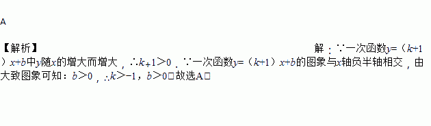 已知一次函数y=(k+1)x+b的图象与x轴负半轴相交,且函数值y随自变量x的增大而增大,则k,b的取值情况为( )