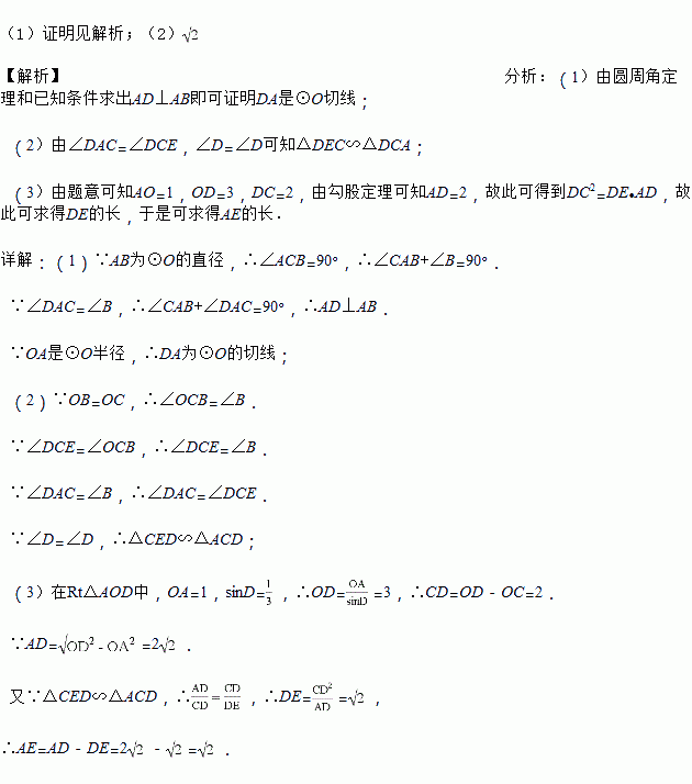 如图,已知AB是⊙O的直径,点C为圆上一点,点D在OC的延长线上,连接DA,