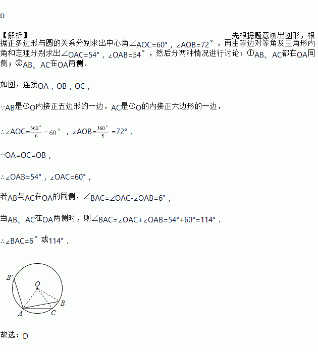 若AB是⊙O内接正五边形的一边,AC是⊙O内接正六边形的一边,则∠BAC等于( )