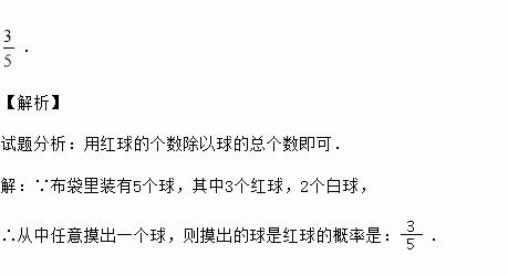 . 【解析】 试题分析:用红球的个数除以球的总个数即可. 【解析】 ∵布袋里装有5个球,其中3个红球,2个白球, ∴从中任意摸出一个球,则摸出的球是红球的概率是:.