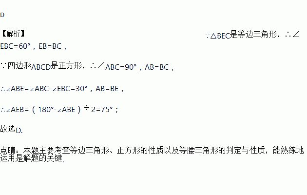 如图,在正方形ABCD内部作等边三角形BCE,则∠AEB的度数为( )