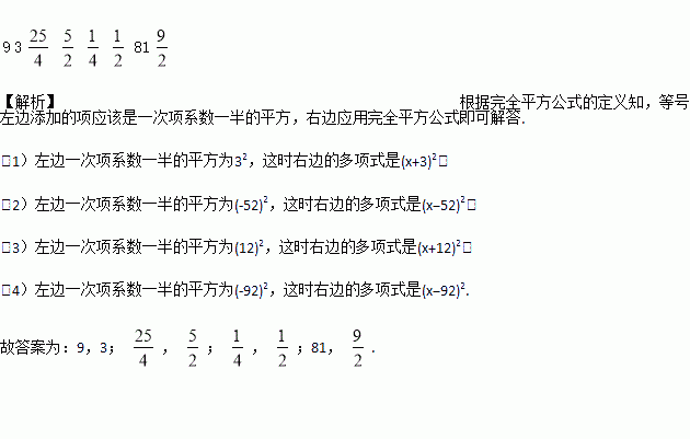 ③x2+ x+______=(x+____)2 ④x2-9x+_____=(x-____)2