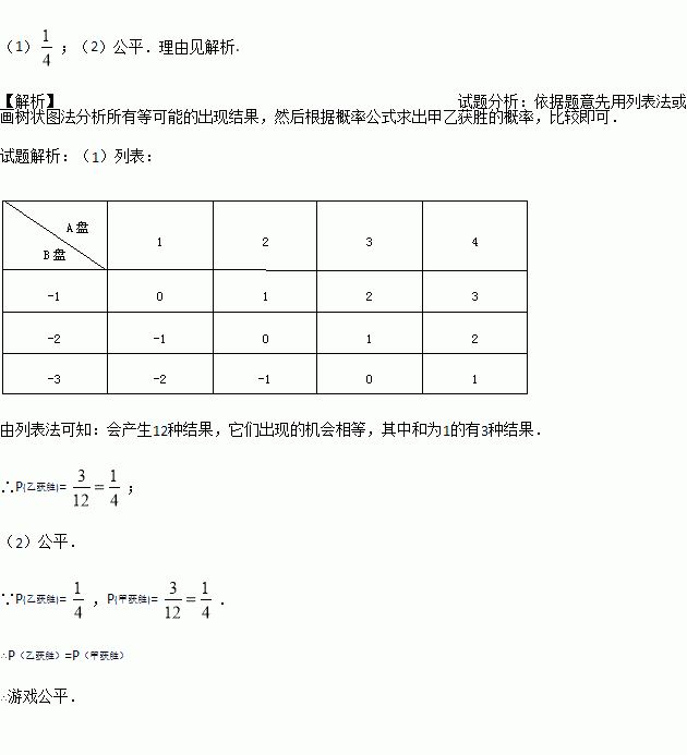如图,甲、乙两人在玩转盘游戏时,准备了两个可以自由转动的转盘A、B,每个转盘被分成面积相等的几个扇形,并在每一个扇形内标上数字.游戏规则:同时转动两个转盘,当转盘停止后,指针所指区域的数字之和为0时,甲获胜;数字之和为1时,乙获胜.如果指针恰好指在分割线上,那么重转一次,直到指针指向某一区域为止.