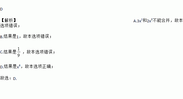 D 【解析】A.3x2和2x3不能合并,故本选项错误; B.结果是1,故本选项错误; C.结果是,故本选项错误; D.结果是x6,故本选项正确; 故选:D.如图所示,有一个长方体,它的长、宽、高分别为5cm,3cm,4cm.在顶点A处有一只蚂蚁,它想吃到与顶点A相对的顶点B的食物.