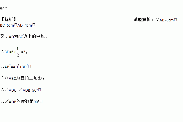 如图,△ABC中,AB=5cm,BC=6cm,BC边上的中线AD=4cm,则∠ADB的度数是________.
