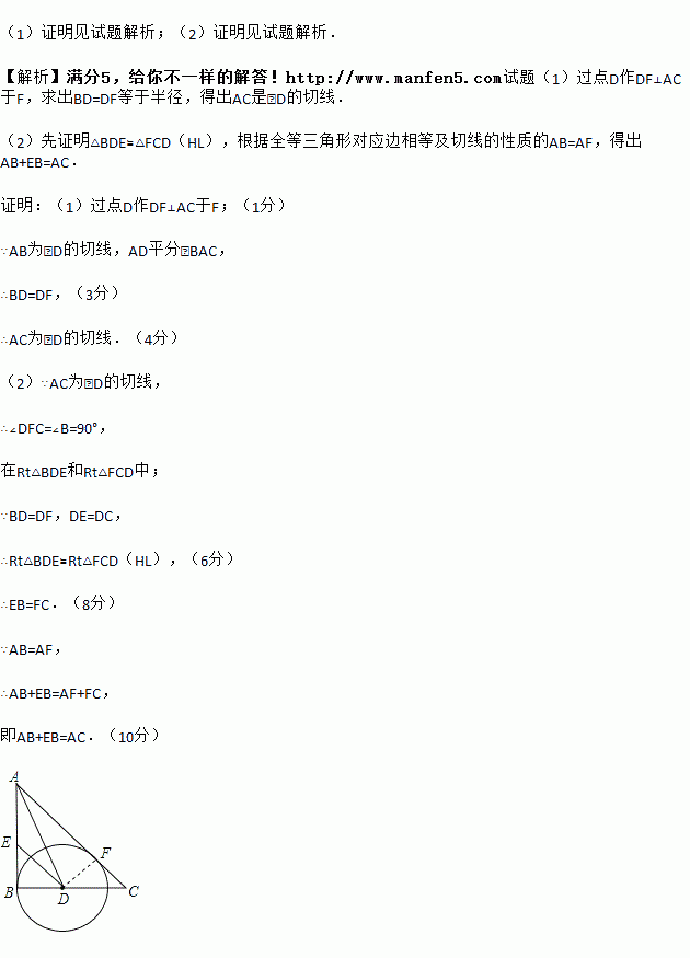 求证:(1)AC是⊙D的切线;(2)AB+EB=AC.