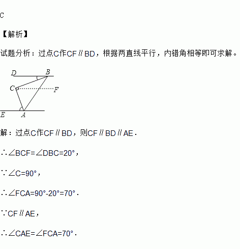 C 【解析】 试题分析:过点C作CF∥BD,根据两直线平行,内错角相等即可求解。 【解析】 过点C作CF∥BD,则CF∥BD∥AE. ∴∠BCF=∠DBC=20°, ∵∠C=90°, ∴∠FCA=90°-20°=70°. ∵CF∥AE, ∴∠CAE=∠FCA=70°.