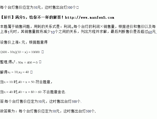 某商场将进货价为30元的台灯以40元的价格售出,平均每月能售出600个,经调查表明,这种台灯的售价每上涨1元,其销量就减少10个,市场规定此台灯售价不得超过60元,为了实现销售这种台灯平均每月10000元的销售利润,售价应定为多少元?这时售出台灯多少个?