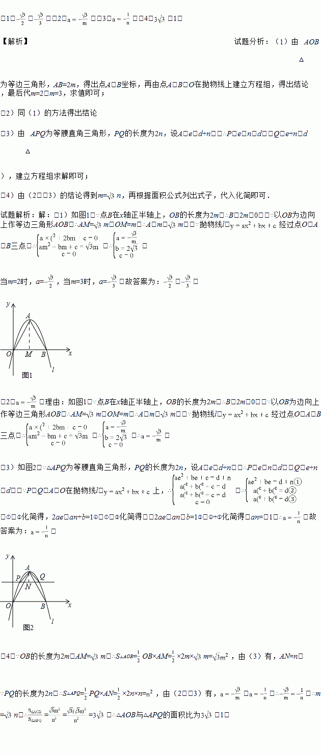 (3)如图2,在图1的基础上,作x轴的平行线交抛物线l于P、Q两点,PQ的长度为2n,当△APQ为等腰直角三角形时,a和n的关系式为 ;