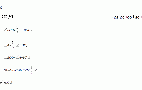 如图,⊙O的半径为2,点A为⊙O上一点,半径OD⊥弦BC于D,如果∠BAC=60°,那么OD的长是( )