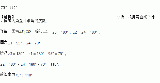 如图,直线AB∥CD,∠1=95°,∠4=70°,则∠3=__________,∠2=____________.