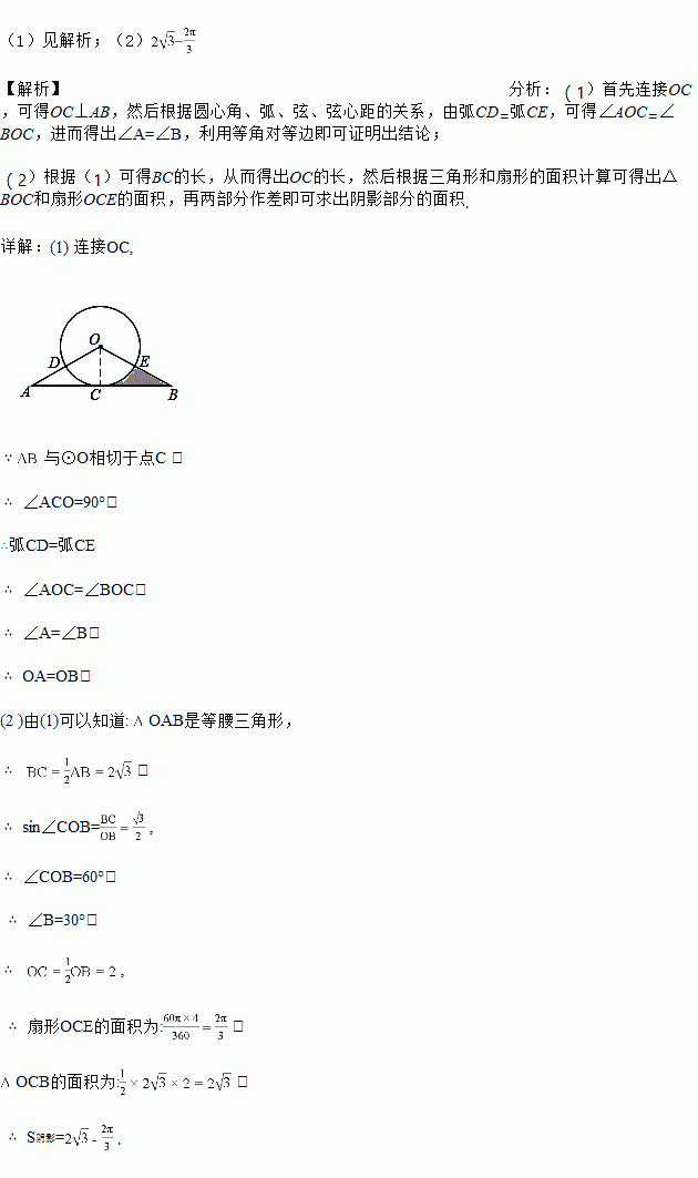 如图,AB与⊙O相切于点C,OA,OB分别交⊙O于点D,E,弧CD=弧CE.