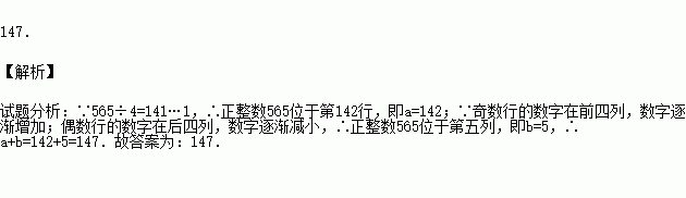 若正整数565位于第a行,第b列,则a+b= .