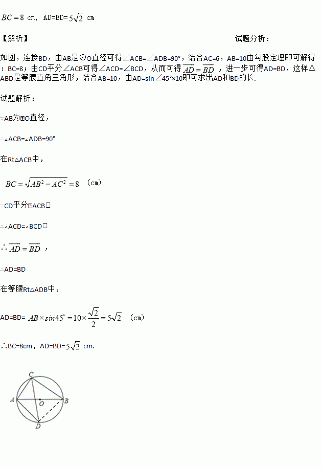 已知:如图,在⊙O中,直径AB的长为10cm,弦AC的长为6cm,∠ACB的平分线交⊙O于点D,求BC,AD和BD的长。