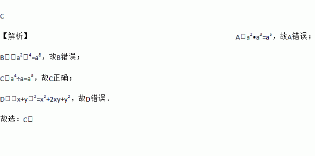A. a2•a3=a6 B. (a2)4=a6 C. a4÷a=a3 D. (x+y)2=x2+y2