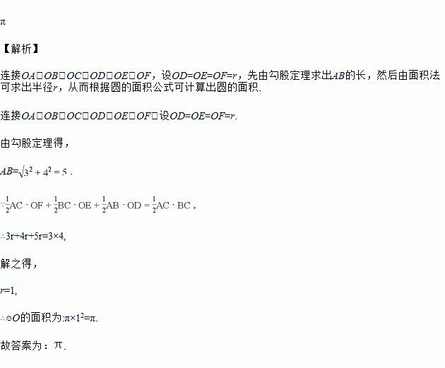 如图,△ABC,AC=3,BC=4,∠C=90°,⊙O为△ABC的内切圆,与三边的切点分别为D、E、F,则⊙O的面积为_____(结果保留π)