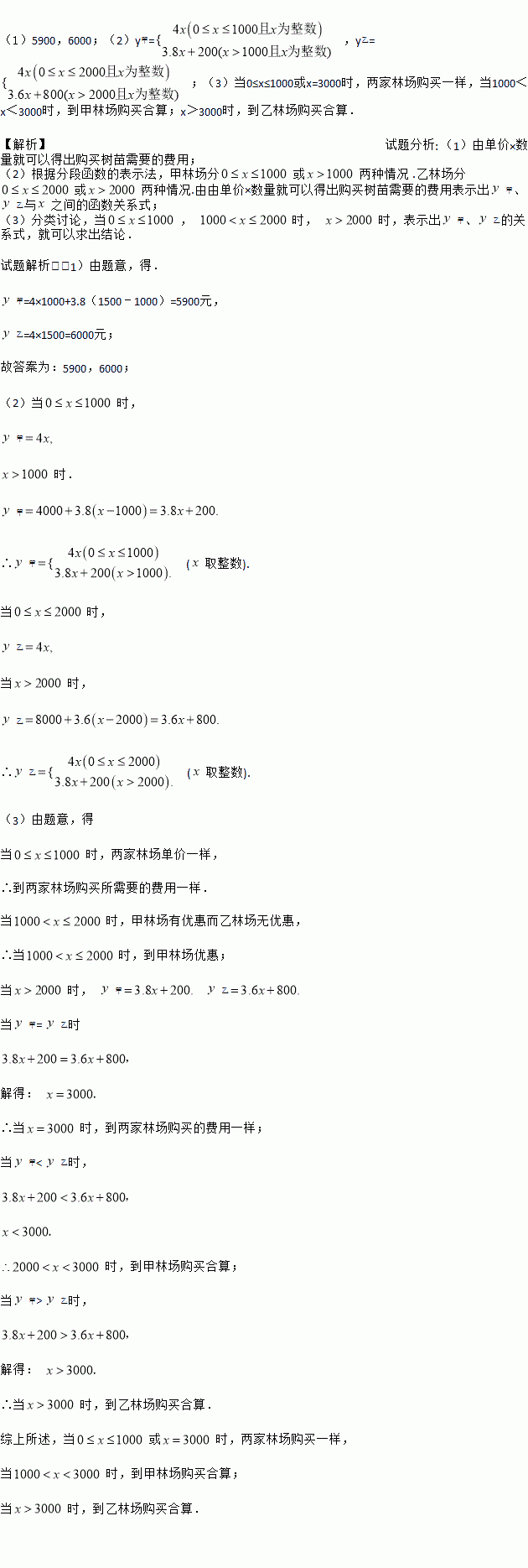 (1)5900,6000;(2)y甲=,y乙=;(3)当0≤x≤1000或x=3000时,两家林场购买一样,当1000<x<3000时,到甲林场购买合算;x>3000时,到乙林场购买合算. 【解析】试题分析: (1)由单价×数量就可以得出购买树苗需要的费用; (2)根据分段函数的表示法,甲林场分或两种情况 .乙林场分或两种情况.由由单价×数量就可以得出购买树苗需要的费用表示出甲、乙与之间的...