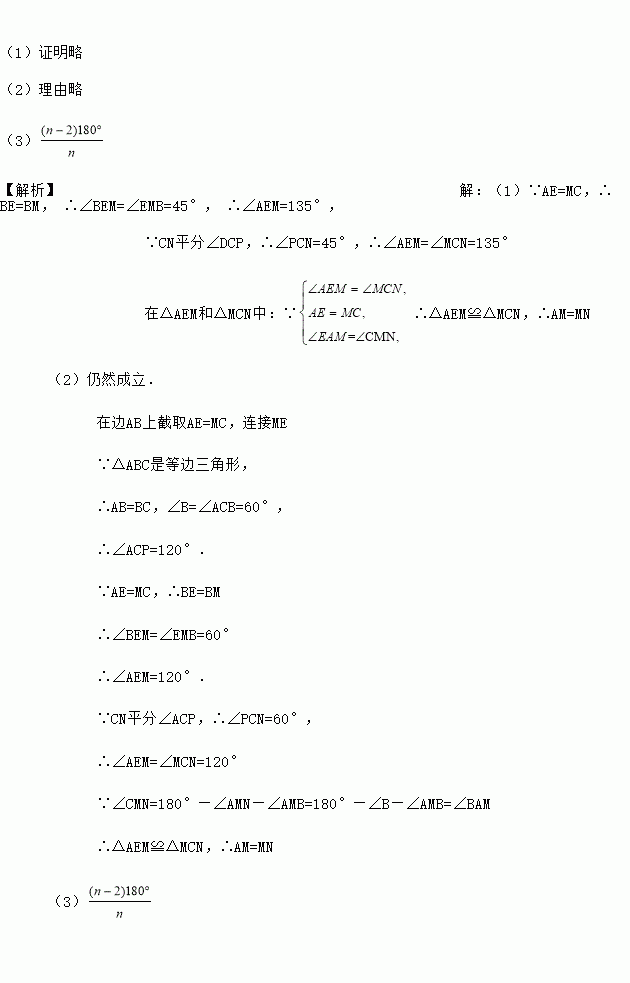 (2)若将(1)中的“正方形ABCD”改为“正三角形ABC”(如图2),N是∠ACP的平分线上一点,则当∠AMN=60°时,结论AM=MN是否还成立?请说明理由.
