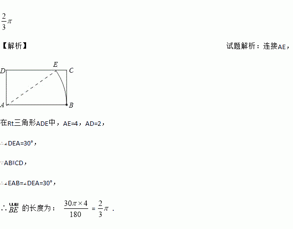 如图,在矩形ABCD中,AB=4,AD=2,以点A为圆心,AB长为半径画圆弧交边DC于点E,则 的长度为___________.