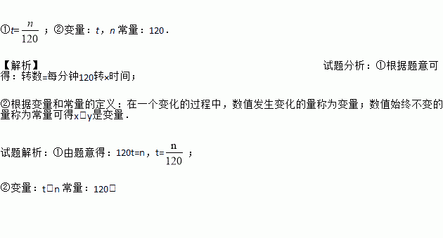 ①t=;②变量:t,n 常量:120. 【解析】试题分析:①根据题意可得:转数=每分钟120转×时间; ②根据变量和常量的定义:在一个变化的过程中,数值发生变化的量称为变量;数值始终不变的量称为常量可得x、y是变量. 试题解析:①由题意得:120t=n,t=; ②变量:t,n 常量:120.