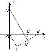 | (2)过点C作CH⊥x轴于点H 在Rt△ABO中,∠ABO=30°, ∴ 即 又∵CD垂直平分AB ∴BC=2, 在Rt△CBH中,CH= ∴ ∴ ∵∠DGO=60° ∴ ∴ ∴D(0,4) 设直线CD的解析式为:y=kx+b 则 解得 ∴ |