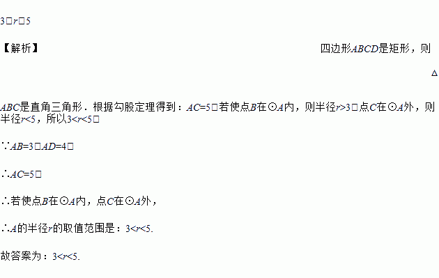 在矩形ABCD中,AB=3,AD=4,以点A为圆心,r为半径画圆,若使点B在⊙A内,点C在⊙A外,则半径r的取值范围是______.