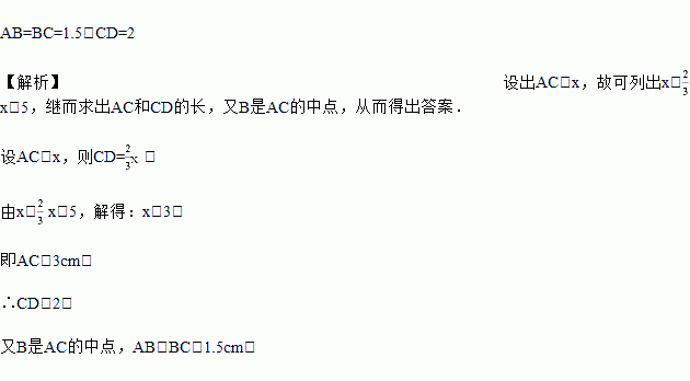 如图,已知AD=5 cm,B是AC的中点,CD=AC.求AB、BC、CD的长.