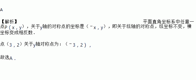 A 【解析】平面直角坐标系中任意一点P(x,y),关于y轴的对称点的坐标是(﹣x,y),即关于纵轴的对称点,纵坐标不变,横坐标变成相反数. 点(3,2)关于y轴对称点为:(﹣3,2), 故选A.