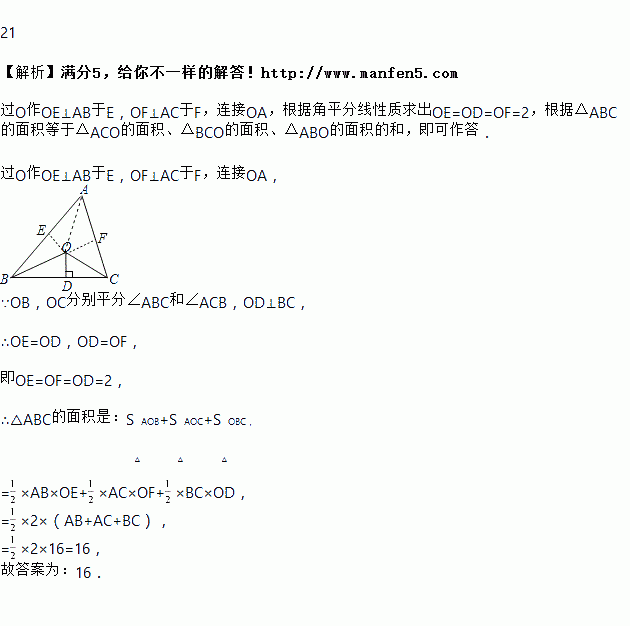 如图,已知△ABC的周长是16,OB、OC分别平分∠ABC和∠ACB,OD⊥BC于D且OD=2,△ABC的面积是________________.