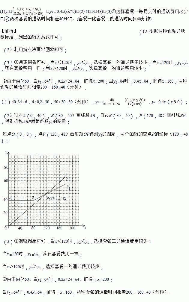 移动公司推出两种话费套餐,套餐一:每月收取月租34元后,送50分钟的通话时间,超过50分钟的部分每分钟收费0.2元,并约定每月最低消费40元(当月通话费用不足40元,一律按40元收取);套餐二:每月没有最低消费,但每分钟均收取0.4元的通话费用.若分别用y1,y2(单位:元)表示套餐一、套餐二的通话费用,用x(单位:分钟)表示每个月的通话时间.