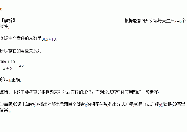 某人生产一种零件,计划在30天内完成,若每天多生产6个,则25天完成且还多生产10个,问原计划每天生产多少个零件?设原计划每天生产x个,列方程式是( )