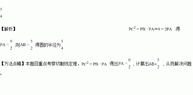 如图,P为⊙O的直径AB延长线上的一点,PC切⊙O于点C,弦CD⊥AB,垂足为点E,若PC=3,PB=2.则圆的半径为________