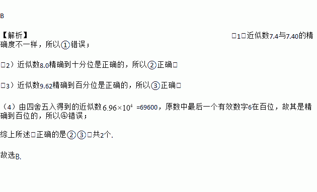 B 【解析】(1)近似数7.4与7.40的精确度不一样,所以①错误; (2)近似数8.0精确到十分位是正确的,所以②正确; (3)近似数9.62精确到百分位是正确的,所以③正确; (4)由四舍五入得到的近似数=69600,原数中最后一个有效数字6在百位,故其是精确到百位的,所以④错误; 综上所述,正确的是②③,共2个. 故选B.