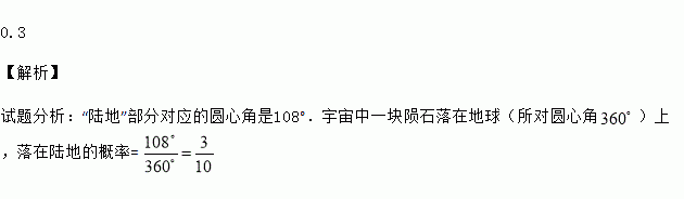 0.3 【解析】 试题分析:“陆地”部分对应的圆心角是108°.宇宙中一块陨石落在地球(所对圆心角)上,落在陆地的概率=