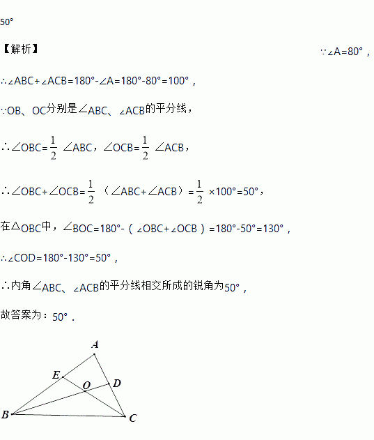 一角为80°的三角形中,另两角的角平分线相交所成的锐角是________.