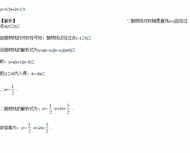 已知抛物线y=ax2+bx+c的对称轴为x=2,且经过点(1,4)和点(5,0),则该抛物线的解析式为__________.