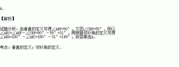 如图,直线AB、CD相交于点E,EF⊥AB于E,若∠CEF=59°,则∠AED的度数为( )